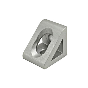 The 2 hole - gusseted inside corner bracket is a strong, external fastening method that creates a 90 degree connection. It requires no machining services and can provide infinite positioning along the profile T-slot, allowing a large degree of adjustability. The shape of the gusset provides extra material, strengthening the connection. The 2 hole - gusseted inside corner bracket engages the 2-degree drop-lock feature when the assembly bolts are tightened to the required torque.